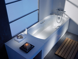 Эмалированная ванна из штампованной стали, со встроенными подлокотниками, хромированными металлическими ручками и звукоизоляцией.