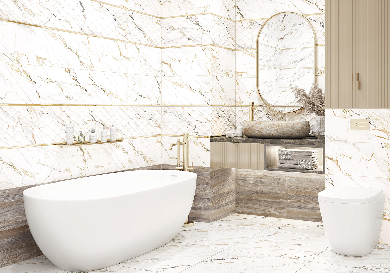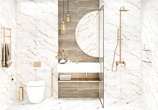 Коллекция Detroit выполнена в тёплой гамме природных материалов белого мрамора и дерева. Акцентный элемент коллекции с текстурой золотой калакатты выполнен на объемном волнообразном рельефе. Базовые плитки с такой же текстурой являются гармоничным компаньоном к плитке с текстурой древесины ясеня. Вместе они создадут индивидуальный дизайн в современном стиле. Коллекция произведена в формате 249×500 мм, с глянцевой поверхностью, комплектуется керамическим бордюром в золотом цвете 13×500 мм и коллекционным лаппатированным керамогранитом 600×600 мм.