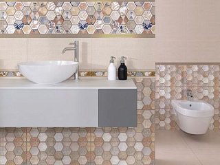 Любителям веселого, насыщенного, яркого оформления помещений эта коллекция обязательно понравится. Фон всех элементов коллекции выдержан в разных оттенках бежевого цвета. Изюминкой коллекции являются декор и бордюр с пестрым мозаичным орнаментом. В напольную часть коллекции вошли два керамогранита с орнаментом и без него.