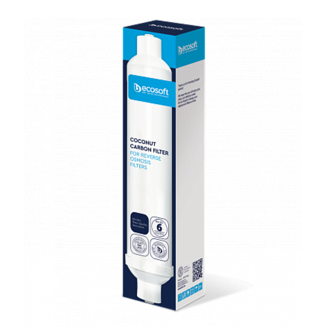 Угольный постфильтр Ecosoft – это картридж, наполненный активированным углем высокого качества из скорлупы кокосовых орехов. Он устанавливается на финальных стадиях очистки в фильтрах обратного осмоса.
