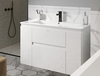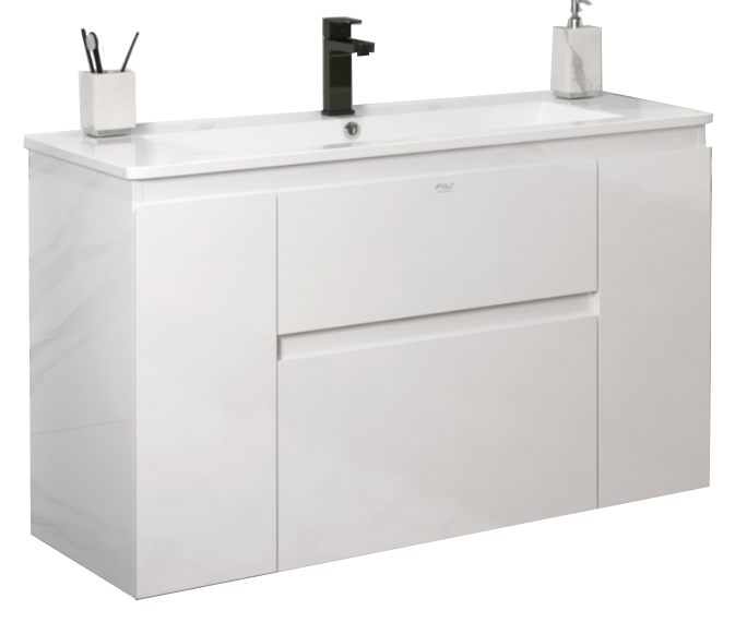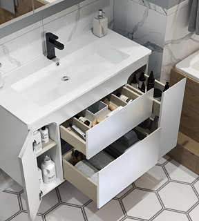 Справа бутылочница. Слева ящик с удобной полочкой для хранения полотенец. Ручки интегрированные в фасад, демонстрируют традиции европейского дизайна. Выполнены по уникальному запилу - в 45 градусов и полностью окрашены в цвет тумбы. Фасады тумбы - окрашены глянцевой эмалью. Стандартный цвет – белый, есть возможность изготовления цвета под заказ. Срок изготовления 3 недели.