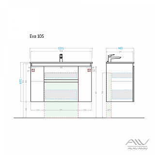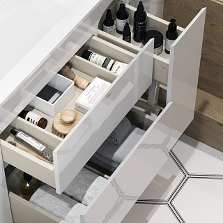 Тумба с раковиной Eva 100 состоит из 4х функциональных отсеков. Посередине 2 вместительных выдвижных ящика с покрытием "интерьерный лен". Внутри ящиков есть удобные съемные делители, которые позволяют грамотно организовать внутреннее пространство.