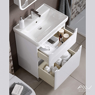 Современная напольная тумба в ванную Лана 70 имеет гладкий фасад и два выдвижных ящика с декоративными зацепами для хранения нужных мелочей. Ящики изготовлены из ДСП с применением фирменного материала Твист. Для удобства они оснащены доводчиками плавного закрывания.