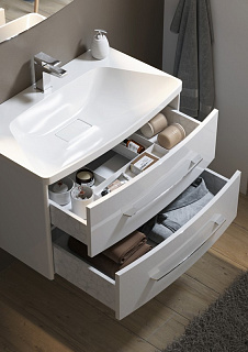 Тумба с раковиной Aqwella 5 stars Neringa 80 прекрасно дополнит современный интерьер ванной комнаты. Подвесной монтаж создаст свободное пространство для удобной уборки пола. Глянцевый блеск белоснежного фасада и хромированных элементов добавят света в небольшое помещение. При изготовлении мебели используется влагостойкая МДФ, покрытая пятью слоями эмали. Система хранения представлена двумя вместительными выдвижными ящиками. В верхнем отделении установлен пластиковый лоток с отсеками для раздельного хранения мелких предметов. Выдвижной фасад украшен удобными ручками с фирменной гравировкой. Ход ящиков плавный и мягкий благодаря скрытым направляющими. Тумба Neringa комплектуется долговечной раковиной из литьевого мрамора. Место слива закрыто декоративной вставкой.