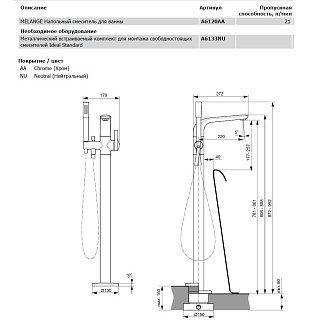 Напольный смеситель для ванны, свободностоящая напольная установка, картридж 40 мм Multiport с функцией HWTC (ограничение максимальной температуры горячей воды), без функции CLICK, металлическая свободностоящая труба, с душе-вым гарнитуром (1- функ. душевая лейка, шланг IdealFlex 1250 мм),автоматическое переключение, металлическая рукоятка с индикатором горячей / холодной воды, аэратор CACHE M21,5 x1. Металлический встраиваемый комплект для монтажа свободно-стоящих смесителей Ideal Standard A6133NU.